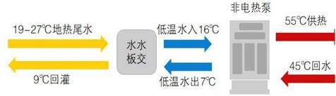 热泵产生 7℃低温冷水与地热尾水进行换热得到 16℃低温热水进热泵机组,45℃采暖回水经热泵加热,提高到 55℃去供热。